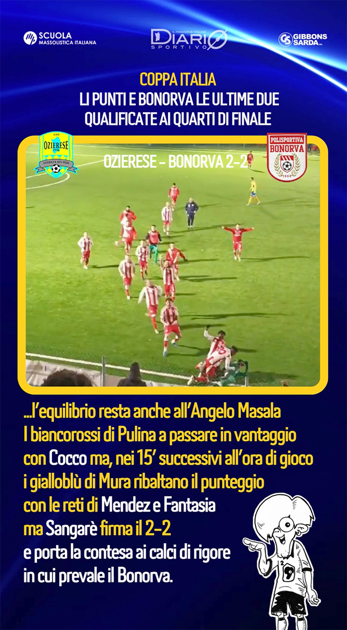 Arrivano anche gli ultimi due verdetti con Li Punti e Bonorva qualificate ai quarti di finale della Coppa Italia di Promozione. Una settimana dopo le sei gare di ritorno degli ottavi di finale - in cui avevano ottenuto la qualificazione Coghinas, Alghero, Arborea, Tonara, Castiadas e Uta Calcio - si è concluso il programma con i due posticipi.